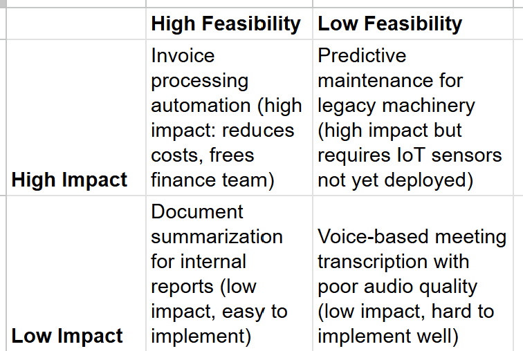 So in this example, you'd start with invoice processing automation, then reassess whether predictive maintenance has become more feasible.