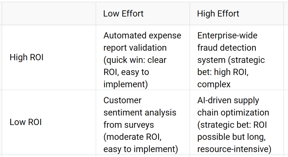Evaluating ROI and level of effort is a similar process. Some opportunities will be quick wins. Others will be long-term strategic bets. Keep both in view, but start by filling a pipeline of initiatives ranked by value and effort. Do not ignore risks; security, compliance, and operational disruption need to be part of the calculation.